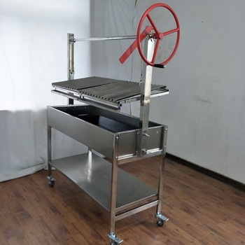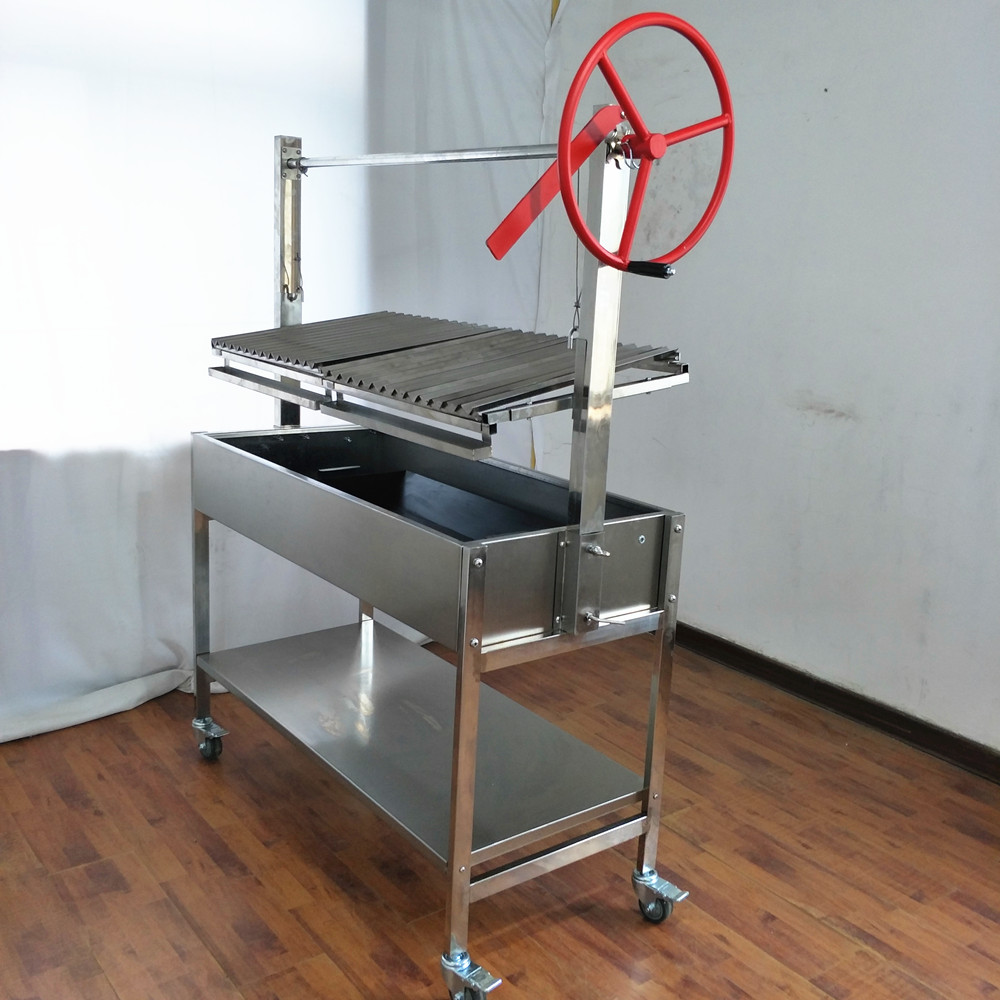 ADJUSTABLE HEIGHT OPEN FLANGE ARGENTINE V-GRATE GRILL. This unit comes with a wheel handle crank.The whole machine all durable stainless steel material.It allows you to cook meat and vegetables at your desired temperature by adjusting how high the BBQ is from the fire.And It is very easy to assemble and clean.With a best cover lid, it will prevent from rain and keep the bbq machine clean.