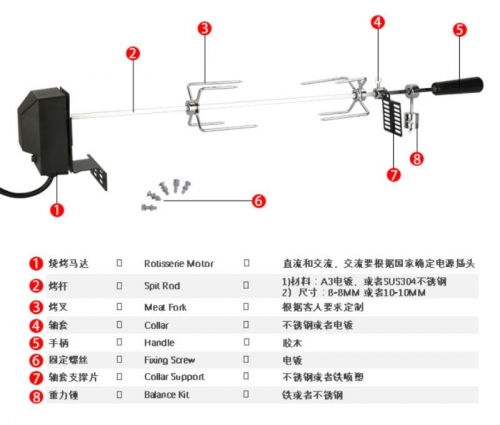 The rotisserie BBQ spits skewer have one long stainless steel 85cm skewer for large chunks of meet,