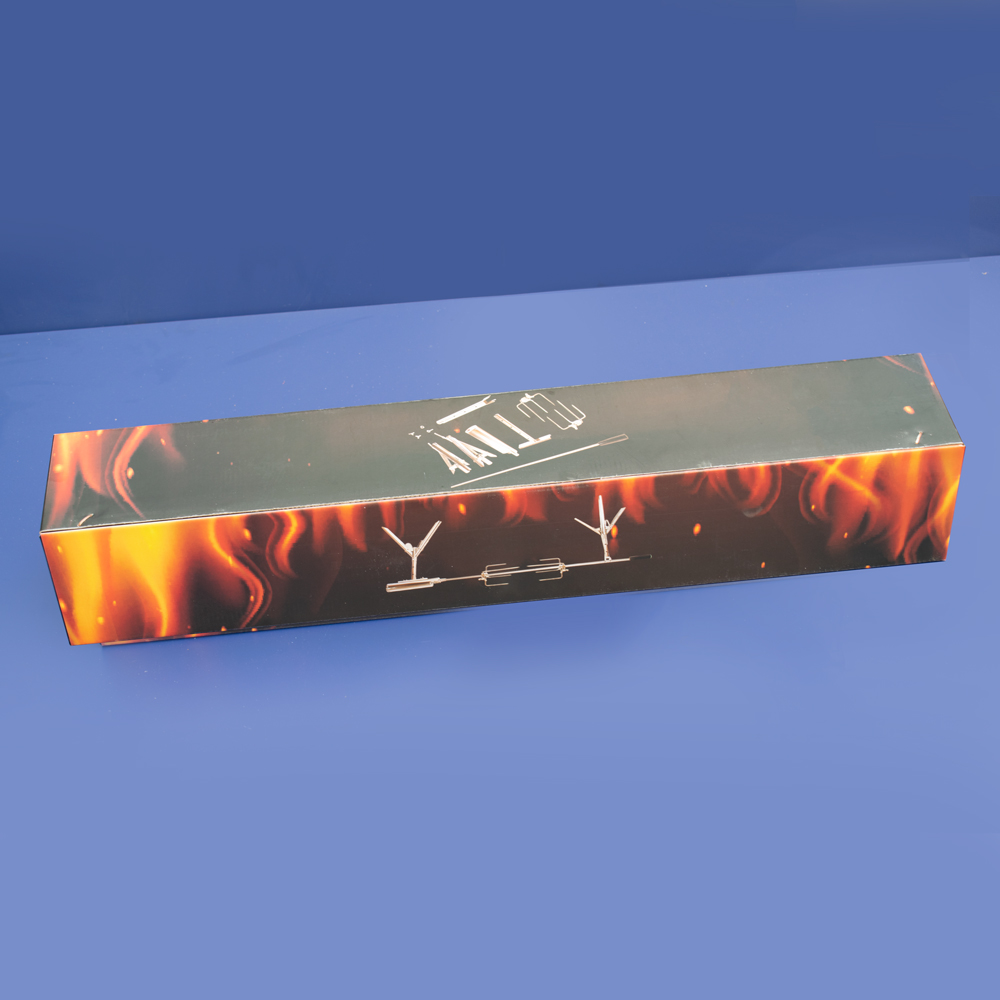 Each case contains a Skewer Disassembled into three parts, a handle containing the motor and a two-cell battery holder, two roasting spit forks, two Adjustable tripods, assembly instructions and a safety manual.